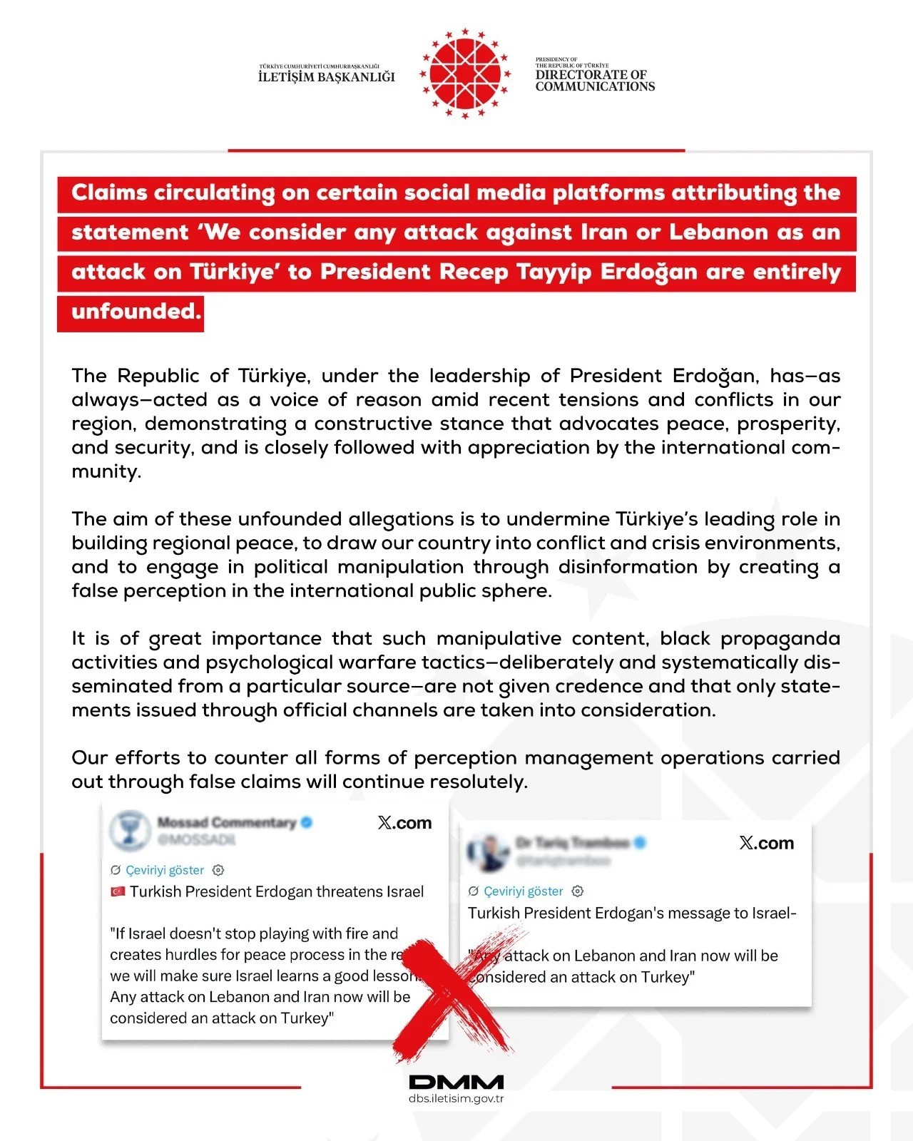 The claim, circulating on certain social media platforms, alleged that the Turkish president stated any attack on Iran or Lebanon would be considered an attack on Turkey.