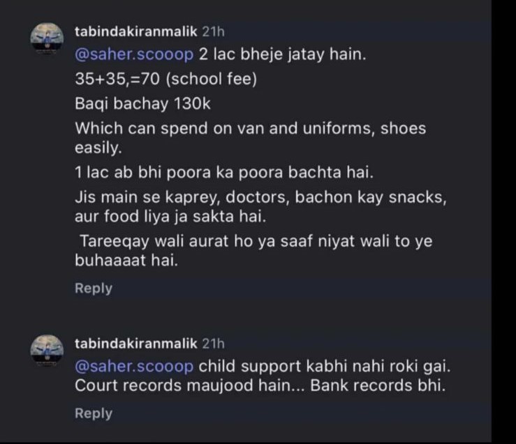 Feroze Khan’s sister, Tabinda Kiran Malik, later stepped in to clarify the situation, stating that Aliza receives Rs200,000 per month from Feroze for child support.