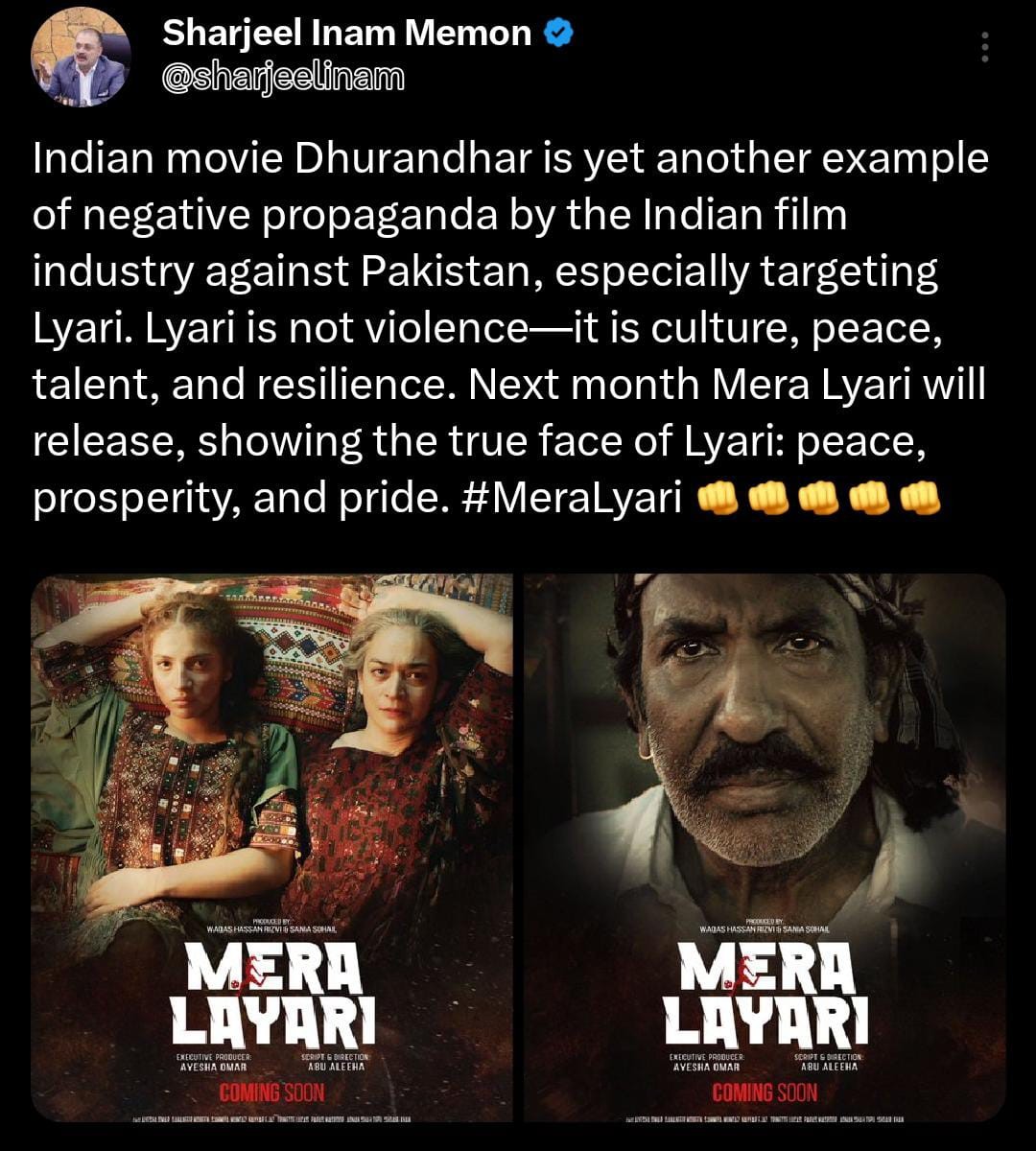 "Indian movie Dhurandhar is yet another example of negative propaganda by the Indian film industry against Pakistan, especially targeting Lyari. Lyari is not violence—it is culture, peace, talent, and resilience. Next month Mera Lyari will release, showing the true face of Lyari: peace, prosperity, and pride. #MeraLyari 👊👊👊👊👊," Memon posted on his X account.