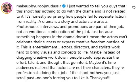 "I just wanted to tell you guys that this shoot has nothing to do with the drama and is not related to it. It’s honestly surprising how people fail to separate fiction from reality. A drama is a story and actors are artists. Photoshoots, interviews, and promotions are part of their job, not an emotional continuation of the plot," the makeup artists Urooj Mudassir responded to the criticism.