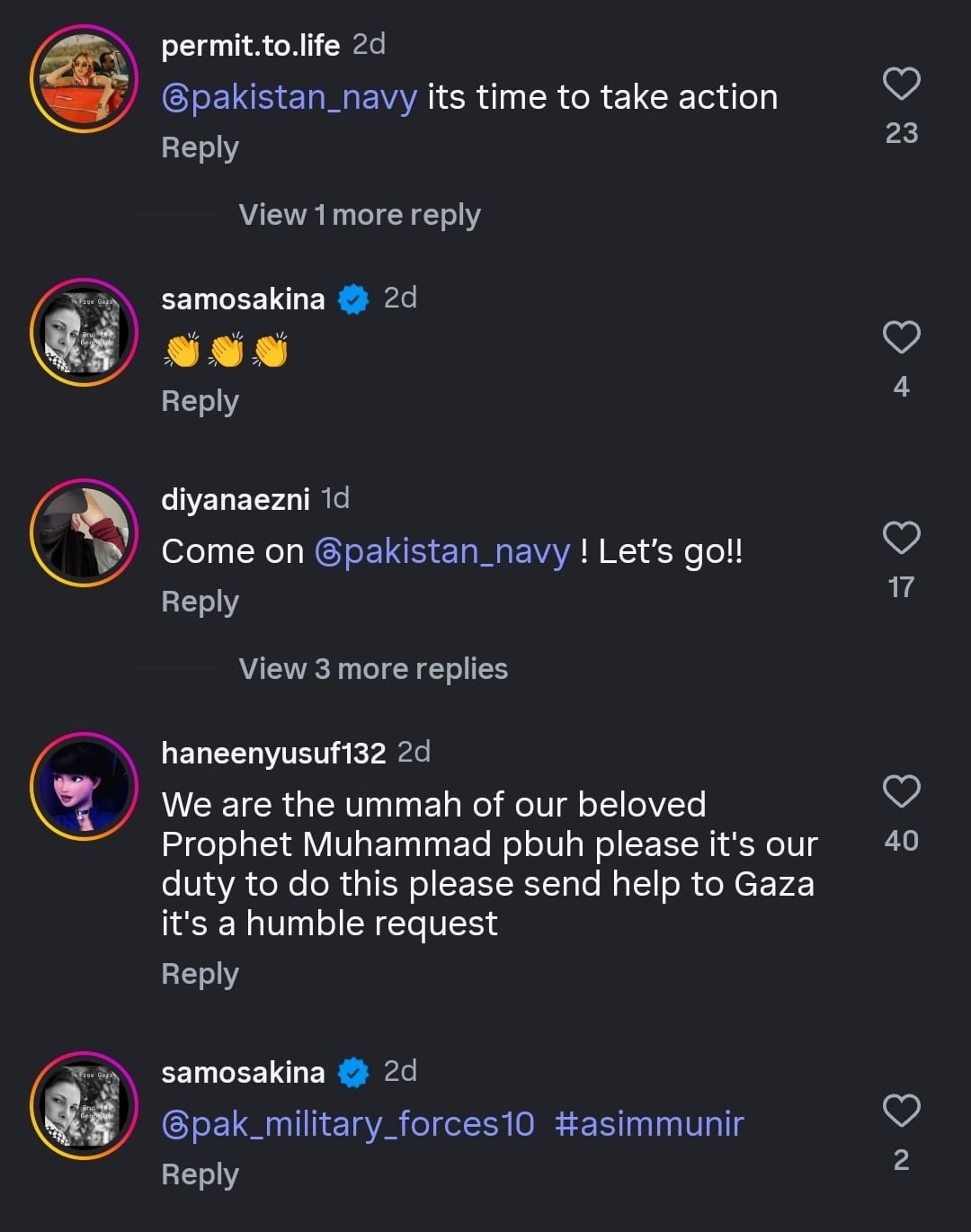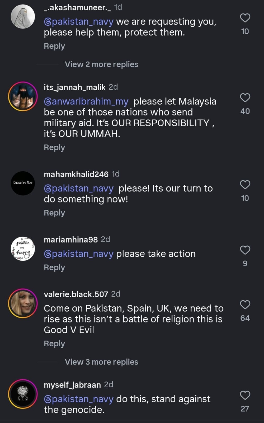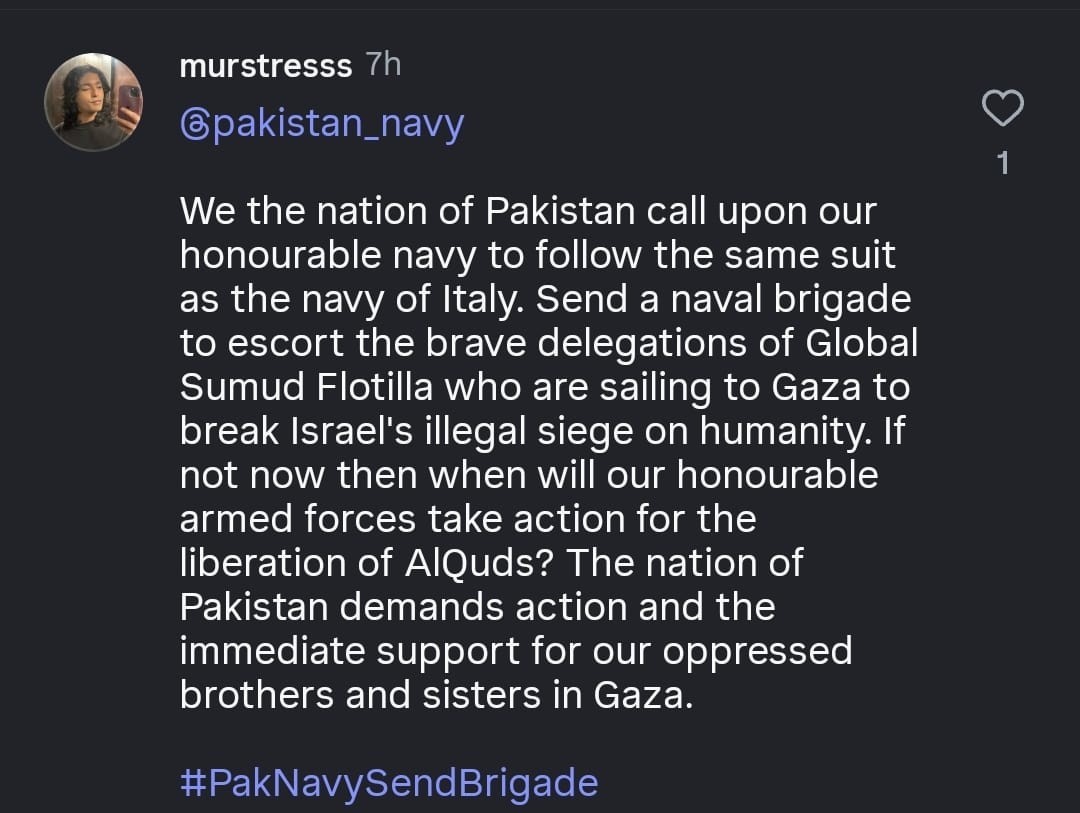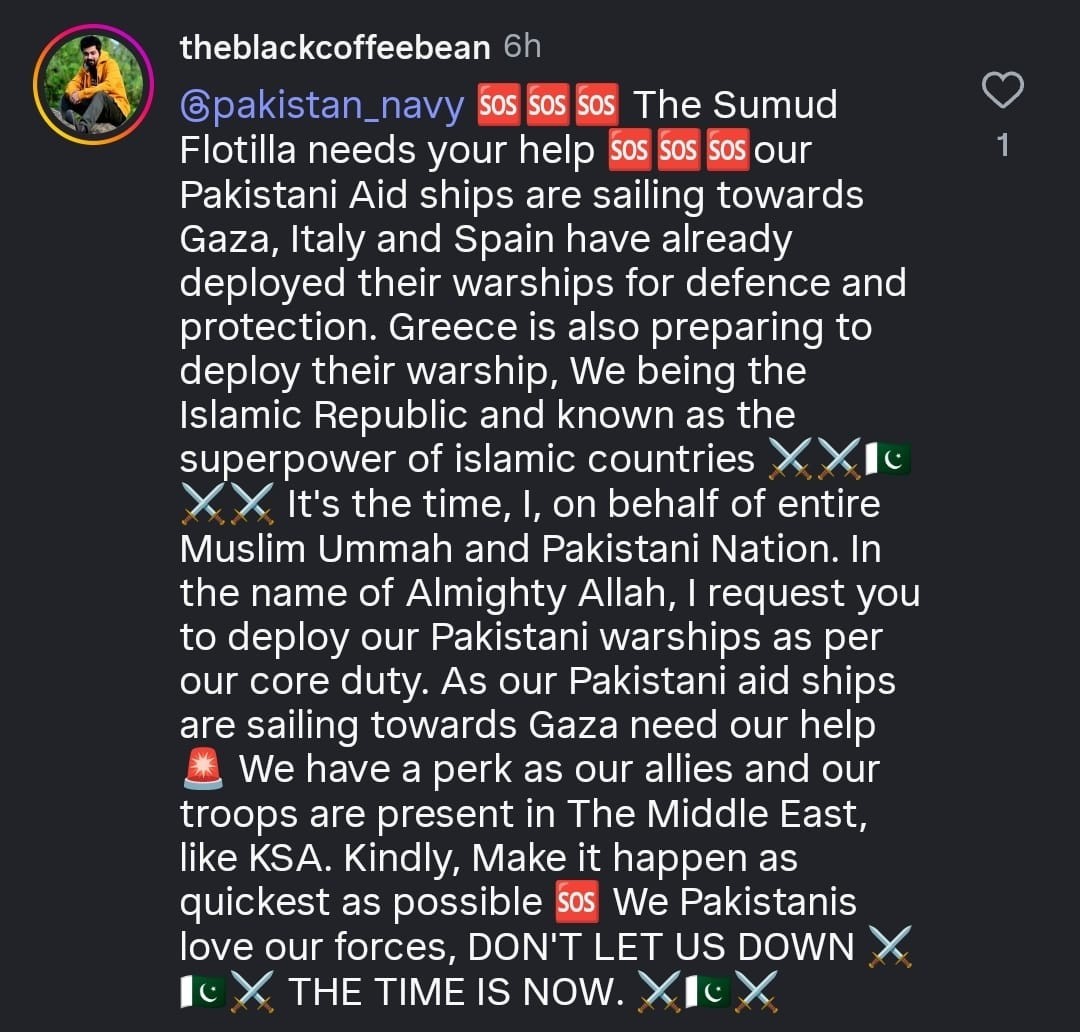 One Instagram page associated with the Pakistani delegation appealed to users to flood the Pakistan Navy’s official account with requests to send naval protection for the flotilla. The call quickly gained traction, with many users voicing support and urging the navy to follow the example of Spain and Italy to ensure the flotilla’s safe passage.