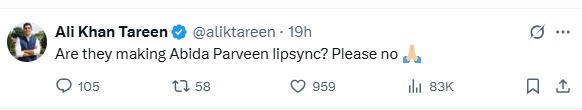 “Are they making Abida Parveen lipsync? Please no đđŒ,” Tareen posted, expressing concern that one of Pakistan’s most revered vocalists was not performing live.