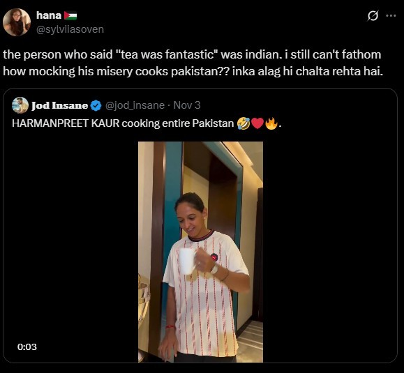 She took a sip from the cup and then clinked it with the trophy, symbolically referencing tea, a gesture many Indian users online used to troll Pakistan.