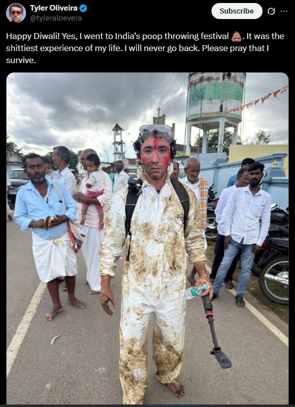 Oliveira described his visit as a “sh*ttiest experience” and shared a short clip of his vlog on X, titled “I survived India’s poop-throwing festival.” The video quickly went viral, garnering millions of views and sparking a wave of criticism from Indian users who accused him of mocking local traditions.