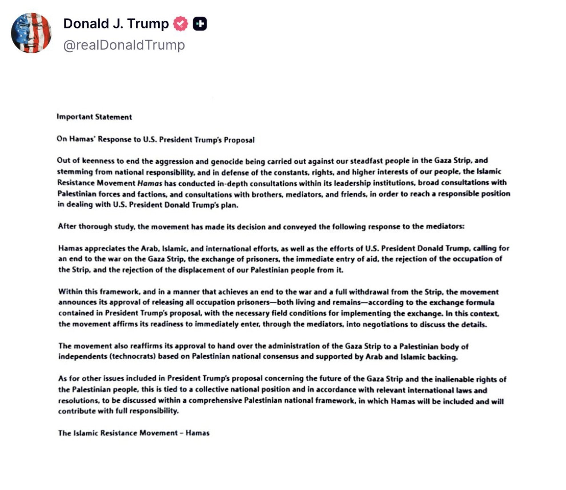 🚨Hamas has formally issued a written response to Trump’s ceasefire “proposal.”