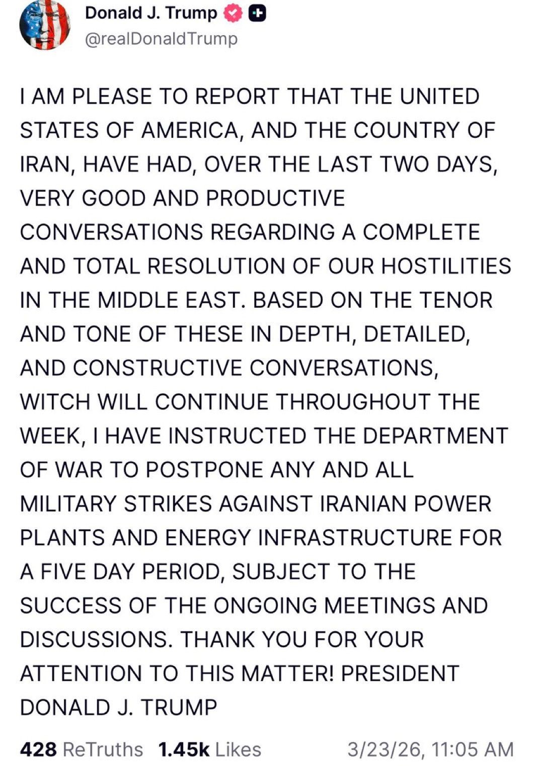“I have instructed the department of war to postpone any and all military strikes against Iranian power plants and energy infrastructure for a five day period, subject to the success of the ongoing meetings and discussions.”