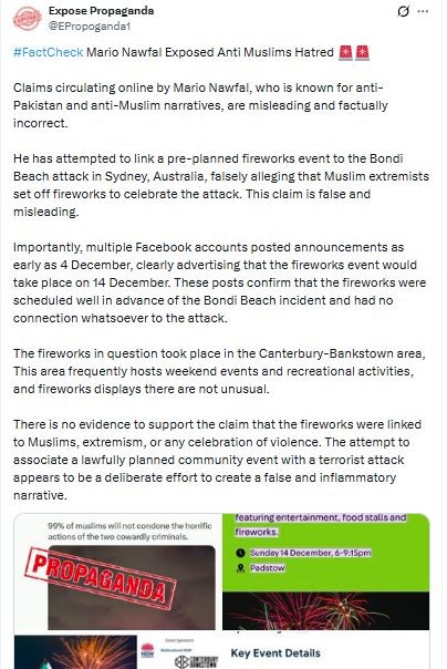 After the deadly attack at Bondi Beach, several posts circulated on social media alleging that “Islamists” were celebrating the violence. A widely shared video showed fireworks lighting up the night sky, with users in Australia and abroad claiming the display was connected to the attack.