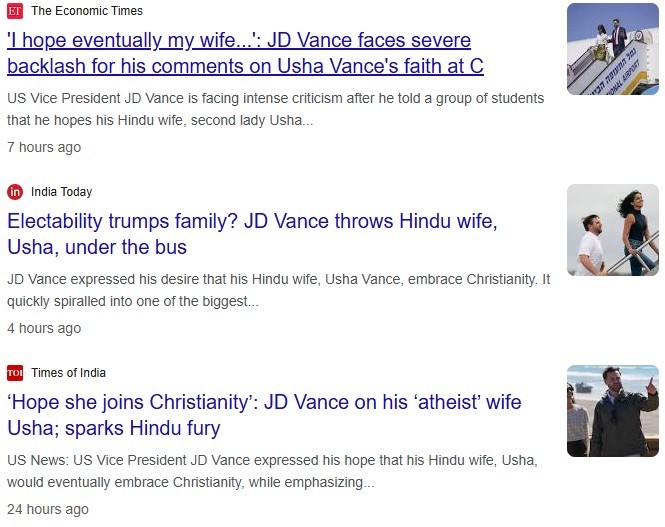 US Vice President JD Vance drew criticism from Indian media after expressing hope that his wife, Usha Vance, would one day convert to Christianity.