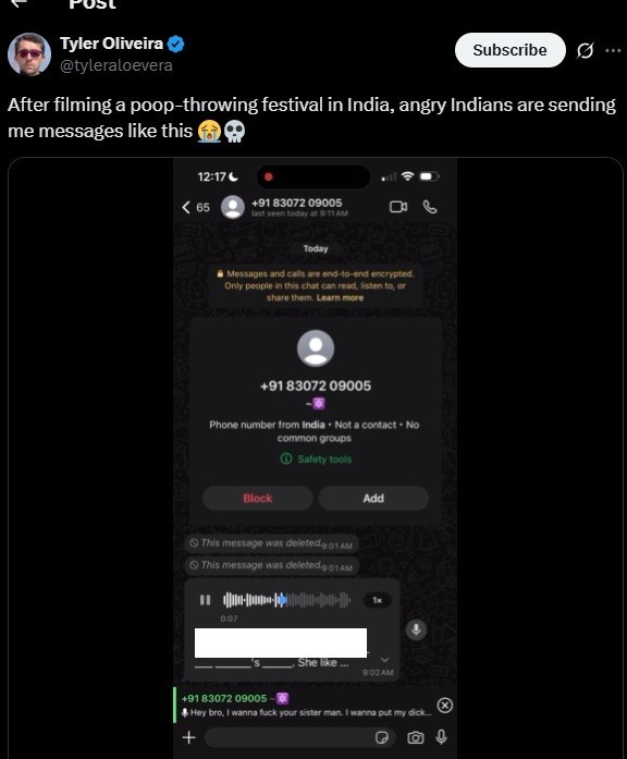 Tyler also shared screenshots of missed calls from Indian numbers and WhatsApp messages threatening to rape his sister. He added that X had censored his post about the cow dung festival in India.
