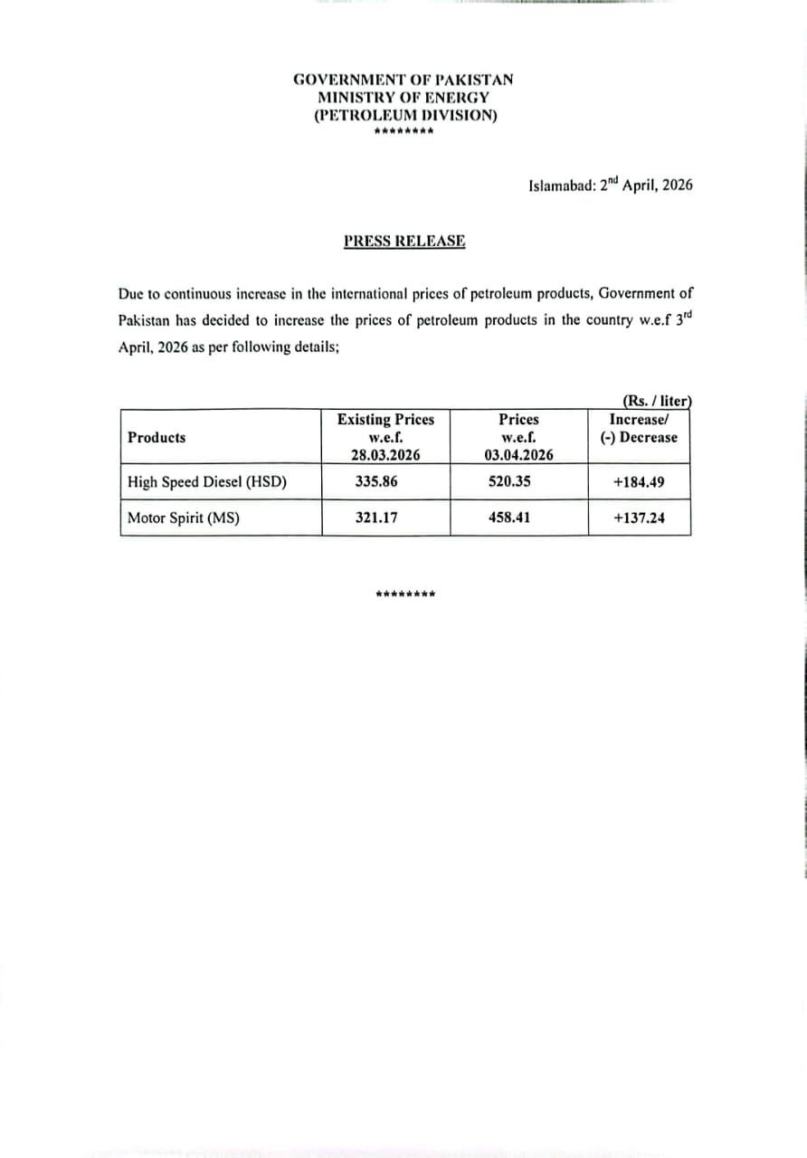 He shared the update during a press conference alongside Finance Minister Muhammad Aurangzeb. The new fuel prices will come into effect from April 3.