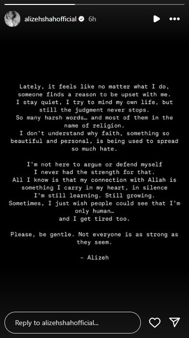 Taking to Instagram, Alizeh shared a cryptic message urging critics to reflect on their harsh behavior. She expressed how the constant negativity takes a toll on her, despite her efforts to remain strong.