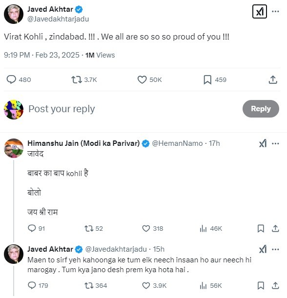 Indian writer and poet Javed Akhtar praised Indian cricketer Virat Kohli’s century against Pakistan in the Champions Trophy match at Dubai International Stadium, but his admiration was met with a barrage of racist slurs from Hindu trolls.