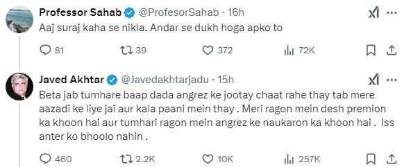 However, some trolls targeted him for his praise, with one writing, “Javed, Babar ka baap Kohli hai (Kohli is Babar’s father). Bolo (say), Jai Shree Ram.” In response, Akhtar sharply retorted, “I will only say that you are a vile person, and you will die a vile death. What do you know about patriotism?”