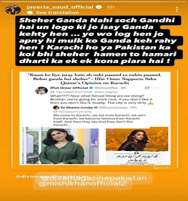 Javeria Saud, however, expressed strong disapproval of Saba Qamar’s and Iffat Omar’s statements. Responding to their comments, Javeria said, “Karachi is not dirty, it’s people’s mindset that is dirty."