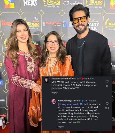 A user had asked whether her original outfit for the event had been spoiled, prompting her to wear a different dress. Refuting the speculation, Mehwish explained that her outfit was a deliberate choice.