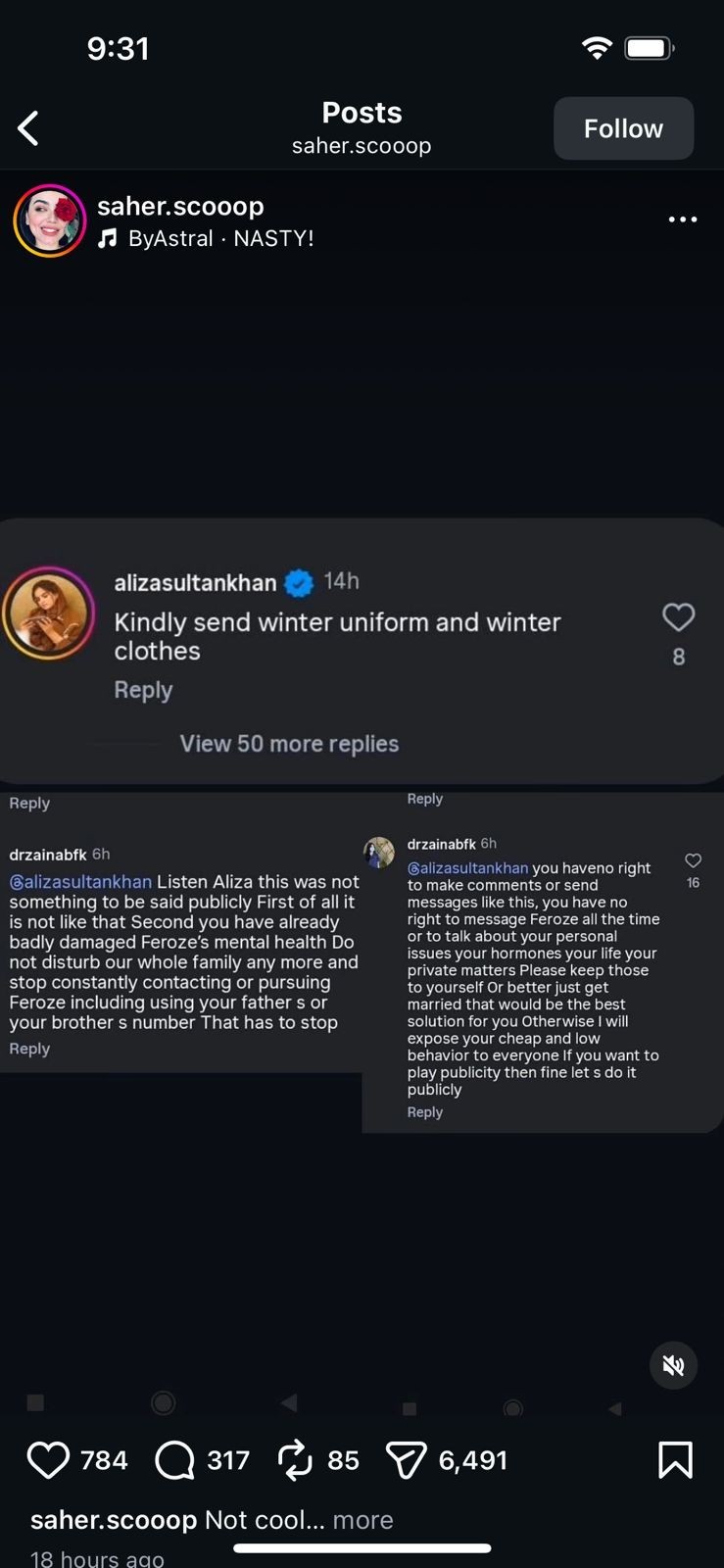 “Listen Aliza, this was not something to be said publicly. First of all it is not like that. Second, you have already badly damaged Feroze’s mental health. Do not disturb our whole family anymore and stop constantly contacting or pursuing Feroze including using your father or brothers number. That has to stop,” she wrote in her reply.