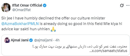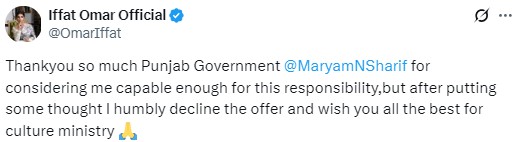 Actress and model Iffat Omar took to X to clarify that while she was offered the position of cultural advisor to the Punjab Minister for Information and Culture, Azma Bukhari, she has respectfully declined the role.