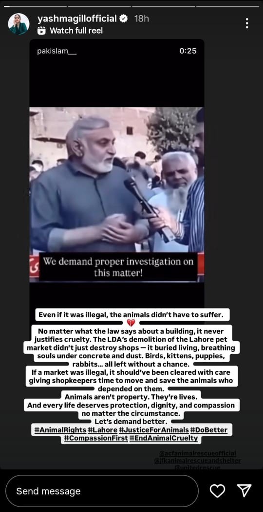 She further emphasized, “No matter whatever the law says about a building, it never justifies cruelty. The LDA demolition of the Lahore pet market didn’t just destroy shops, it buried living, breathing souls under concrete and dust. Birds, puppies, rabbits ,all left without a chance.”