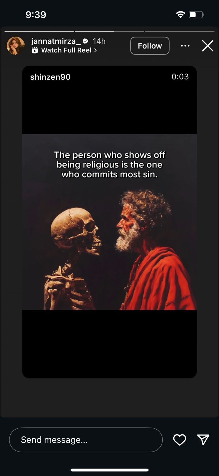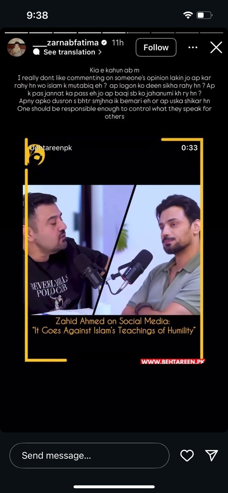 Another digital creator, Alishba, shared a story featuring a picture of Zahid Ahmed with his Dil Dhoondta Hai Phir Wohi co-star Zara Noor Abbas, with the caption, “Talking about Islam with arms around someone else’s wife.”