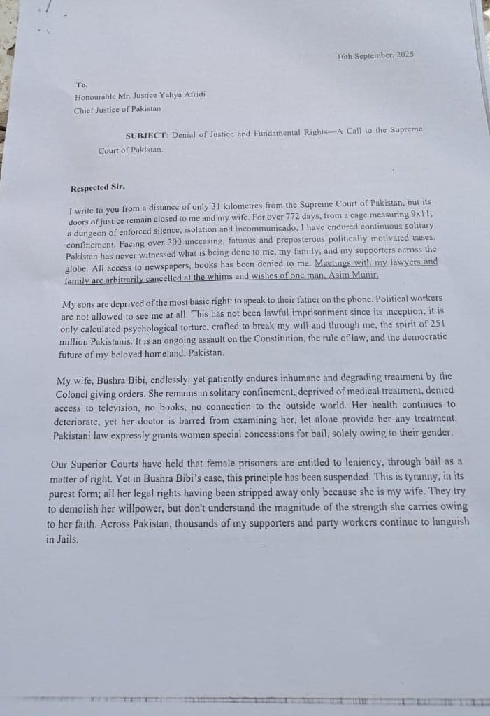 “It is not lawful imprisonment since its inception; it is only calculated psychological torture, crafted to break my will … It is an ongoing assault on the Constitution, the rule of law and the democratic future of my beloved homeland, Pakistan,” he continued.