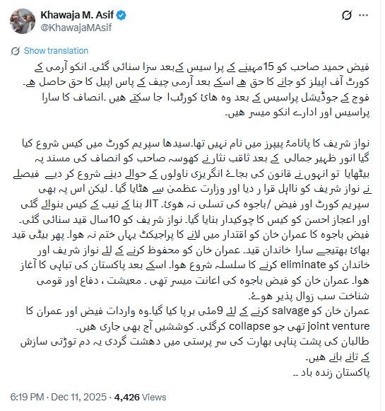 In his post on X, the PML-N leader said that despite the conviction, Faiz Hameed still has full legal recourse available to him. “After a 15-month process, Faiz Hameed has been sentenced. He has the right to appeal before the army court of appeals, and afterwards before the army chief. Once the military judicial process is exhausted, he can approach the high court. The entire system of justice remains open to him,” he wrote.